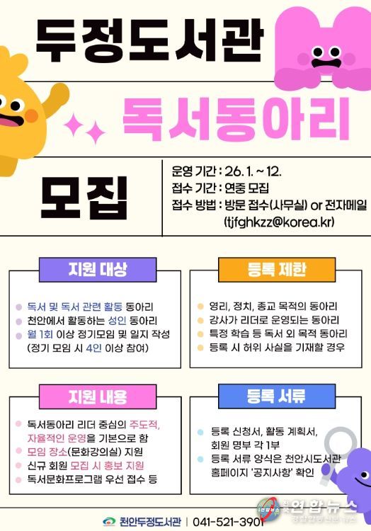 전국연합뉴스 김대환 기자 | 천안시 두정도서관은 책 읽는 공동체 형성을 위해 독서동아리를 모집한다고 30일 밝혔다.