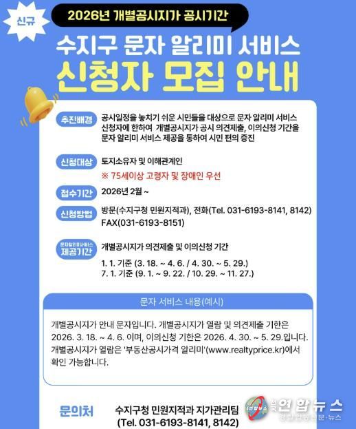 수지구는 이러한 불편을 개선하기 위해 공시 일정에 맞춰 토지소유자와 이해관계인에게 공시기간과 민원 신청기간(의견제출·이의신청)을 문자로 안내하는 알림 서비스를 도입했다.