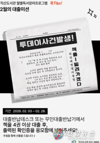 전국연합뉴스 김대환 기자 | 천안시 직산도서관은 2월 ‘북 플렉스(Flex)’ 프로그램으로 ‘투데이 사건 발생!’을 운영한다고 2일 밝혔다.