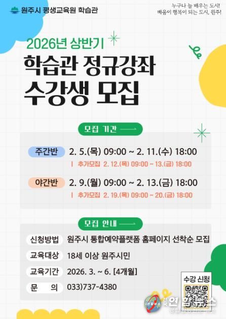 전국연합뉴스 유근택 기자 | 원주시 평생교육원 학습관은 2026년 상반기 정규강좌 주·야간반 수강생을 모집한다.