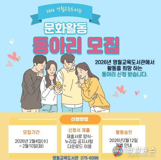 전국연합뉴스 기자 | 영월교육도서관(관장 권예순)은 ‘2026년 문화활동 동아리’를 2월부터 12월까지 운영한다고 4일 밝혔다.