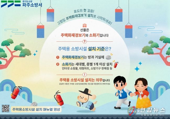 전국연합뉴스 박충곤 기자 | 파주소방서는 설 명절을 맞아 ‘주택용 소방시설 설치하기’ 홍보를 집중 추진하고 있으며, 최근 파주시에서 시민이 소화기를 활용하여 화재를 자체 진화한 사례가 발생해 주택용 소방시설의 중요성이 다시금 주목받고 있다.
