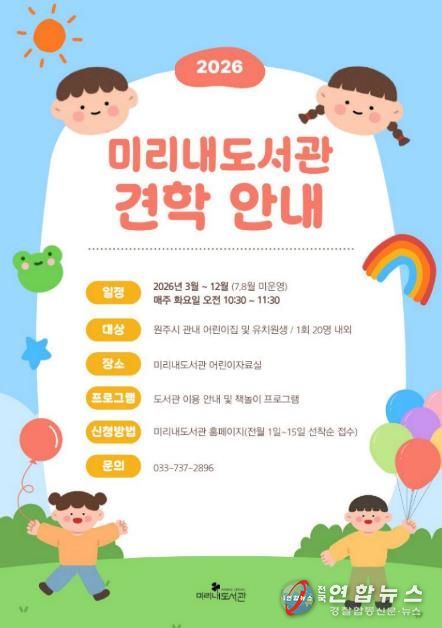 전국연합뉴스 유근택 기자 | 원주시 미리내도서관은 3월부터 12월까지 관내 유치원과 어린이집을 대상으로 어린이 견학 프로그램을 운영한다.