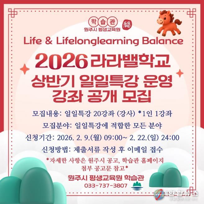 전국연합뉴스 유근택 기자 | 원주시 평생교육원 학습관은 ‘2026년 라라밸학교 상반기 일일특강’ 운영 강좌를 모집한다.