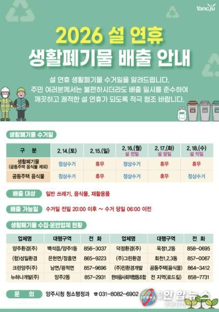 전국연합뉴스 박점규 기자 | 양주시가 설 연휴 기간 시민과 방문객의 불편을 줄이기 위해 ‘2026년 설 연휴 생활폐기물 관리 대책’을 추진한다.