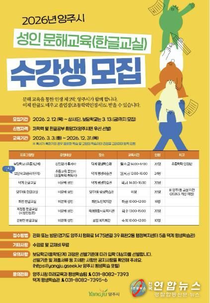 양주시 관계자는 “배움에는 늦은 때가 없는 만큼, 기초 문해교육이 필요한 시민이라면 주저하지 말고 성인 문해교실의 문을 두드려 주시길 바란다”고 말했다.