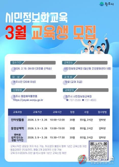 전국연합뉴스 유근택 기자 | 원주시는 시민들의 디지털 활용 능력 향상과 정보 격차 해소를 위해 시민정보화교육 3월 수강생을 모집한다.