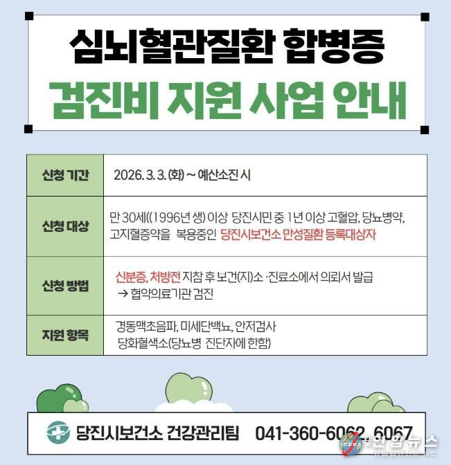 당진시 관계자는 “심뇌혈관질환은 조기 발견과 예방이 중요한 만큼, 이번 지원 사업을 통해 대상자들이 건강을 관리하는 데 도움이 되길 바란다”며, “대상자들은 적극적으로 검진에 참여해 건강을 지키길 바란다”고 전했다.