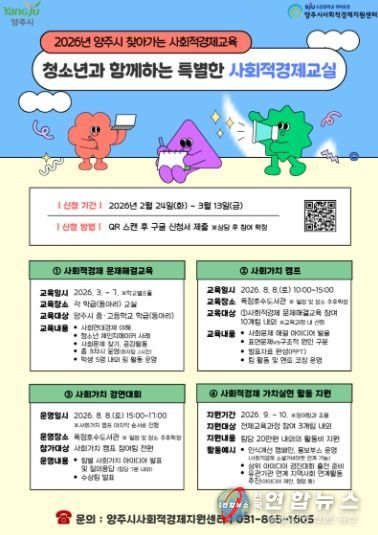 시는 지역 청소년을 대상으로 ‘2026년 양주시 찾아가는 사회적경제교육’ 운영을 위해 현재 참여 학교를 모집 중이라고 4일 밝혔다.