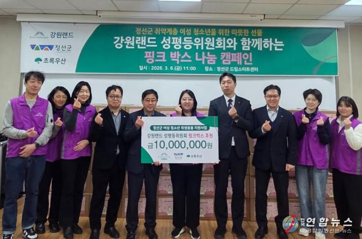 전국연합뉴스 권찬규 기자 | 정선군은 3월 6일 정선군 여성회관 소회의실에서 강원랜드 성평등위원회와 초록우산 어린이재단 강원지역본부가 후원하는 ‘핑크박스’ 전달식을 개최했다.
