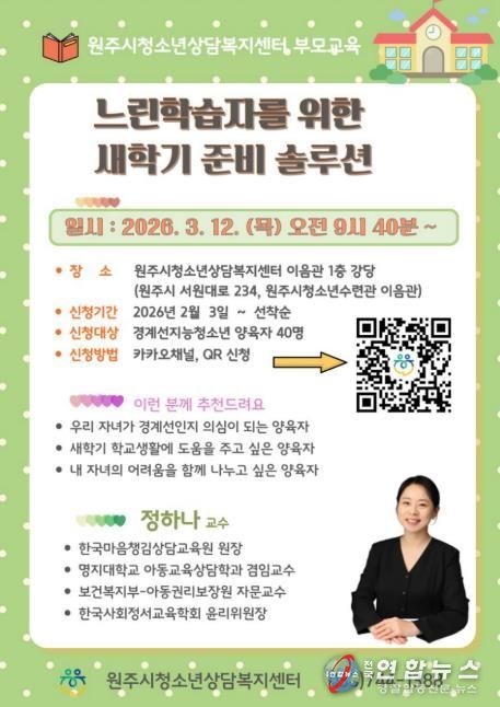 전국연합뉴스 유근택 기자 | 원주시청소년상담복지센터는 지난 12일 센터 1층 강당에서 ‘느린학습자를 위한 새학기 준비 솔루션’을 주제로 경계선 지능 청소년 보호자 교육을 실시했다.