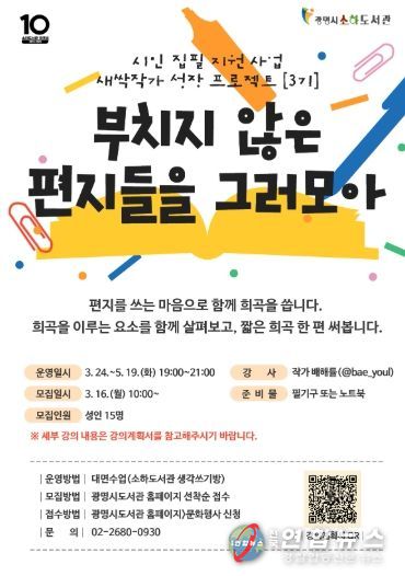 전국연합뉴스 조민준 기자 | 광명시 소하도서관은 시민들의 인문학적 소양을 함양하고 창작 활동을 지원하기 위해 ‘새싹작가 성장 프로젝트 3기’ 수강생을 지난 16일부터 모집하고 있다.