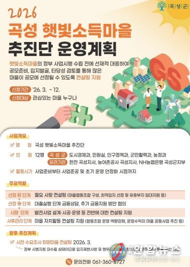 곡성군 관계자는 “햇빛소득마을 추진단을 중심으로 행정과 유관기관이 협력해 마을별 맞춤형 지원체계를 구축해 나가겠다”라며 “사전 컨설팅을 통해 사업 추진 가능성을 꼼꼼히 검토하고 더 많은 마을이 공모사업에 참여할 수 있도록 적극 지원하겠다”라고 말했다.