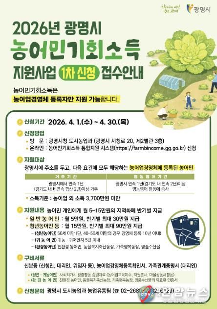 전국연합뉴스 조민준 기자 | 광명시는 오는 4월 1일부터 4월 30일까지 ‘농어민 기회소득 지원사업 1차’ 신청을 받는다.