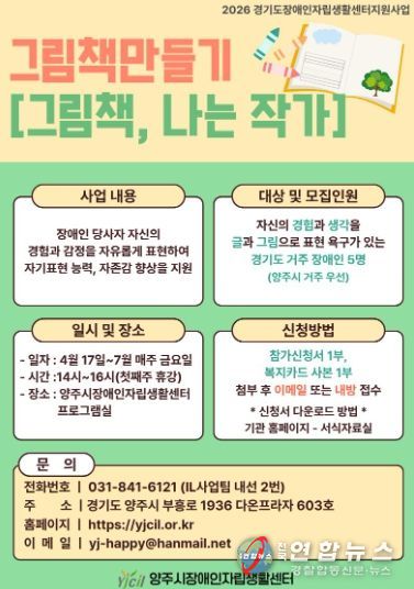 전국연합뉴스 박점규 기자 | 양주시장애인자립생활센터에서는 장애인의 문화·예술 참여 기회를 확대하고 자기 표현의 장을 마련하기 위해 그림책 만들기[그림책, 나는 작가] 참가자를 모집한다.