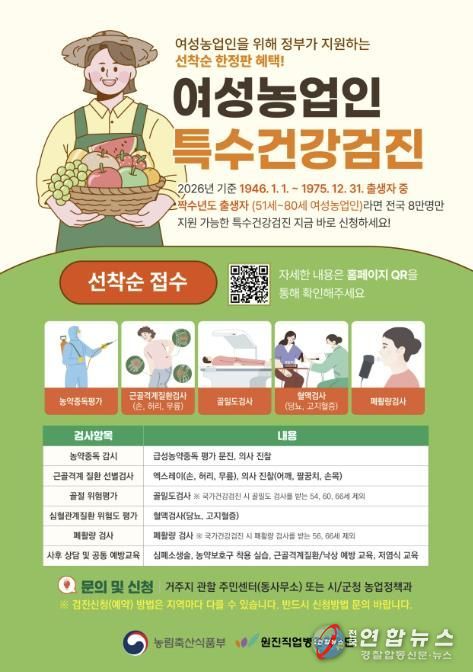 군은 오는 4월 10일까지 관내 거주하는 만 51~80세(1946년 1월 1일~1975년 12월 31일) 사이의 짝수 연도 출생 여성농업인 530여 명을 대상으로 건강검진 지원 신청을 주소지 읍·면 행정복지센터를 통해 접수하고 있다.