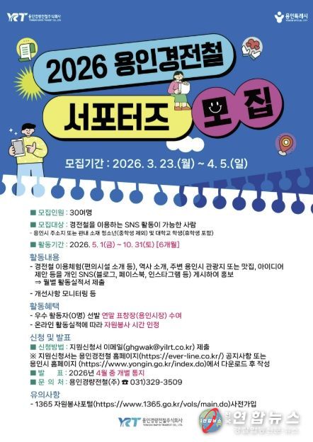 전국연합뉴스 기자 | 용인특례시는 4월 5일까지 용인의 대표적인 철도인 용인경전철을 활성화하고자 ‘용인경전철 서포터즈’를 모집한다고 23일 밝혔다.