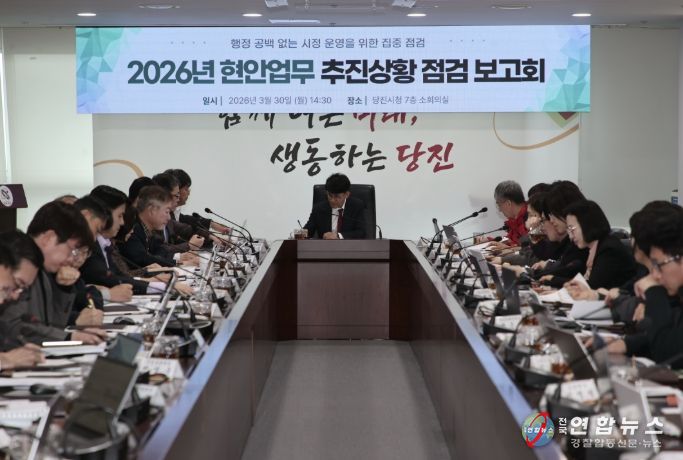 전국연합뉴스 김용태 기자 | 당진시는 지난 30일 당진시청 7층 소회의실에서 당진시장 권한대행 황침현 부시장 주재로 국·소장 및 각 부서장들이 참석한 가운데 2026년 현안업무 추진상황 점검 보고회를 개최했다고 31일 밝혔다.