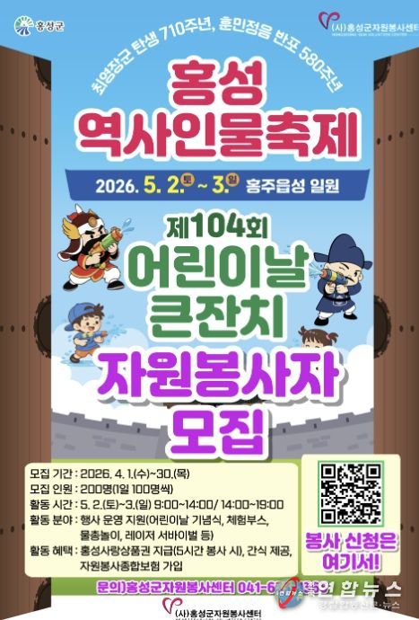 전국연합뉴스 김용태 기자 | (사)홍성군자원봉사센터는 오는 5월 2일부터 3일까지, 이틀간 홍주읍성 일원에서 개최되는 ‘2026 홍성군역사인물축제 × 어린이날 큰 잔치’의 성공적인 운영을 위해 자원봉사자 200명을 모집한다고 밝혔다.