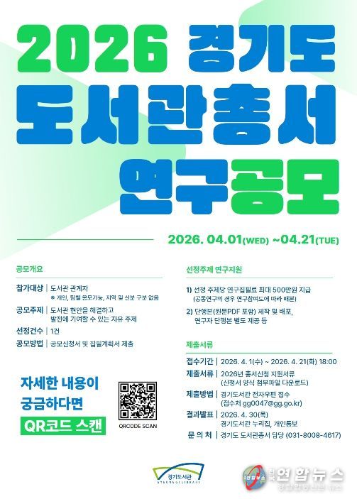 전국연합뉴스 조민준 기자 | 경기도는 도서관 현장의 문제 해결과 서비스 혁신을 위한 ‘2026 경기도 도서관총서 연구 공모’를 추진한다고 7일 밝혔다.