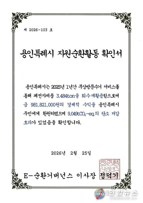 전국연합뉴스 기자 | 용인특례시는 2025년 폐전자제품 무상방문수거 실적에서 경기도 내 1위를 달성했다고 7일 밝혔다.