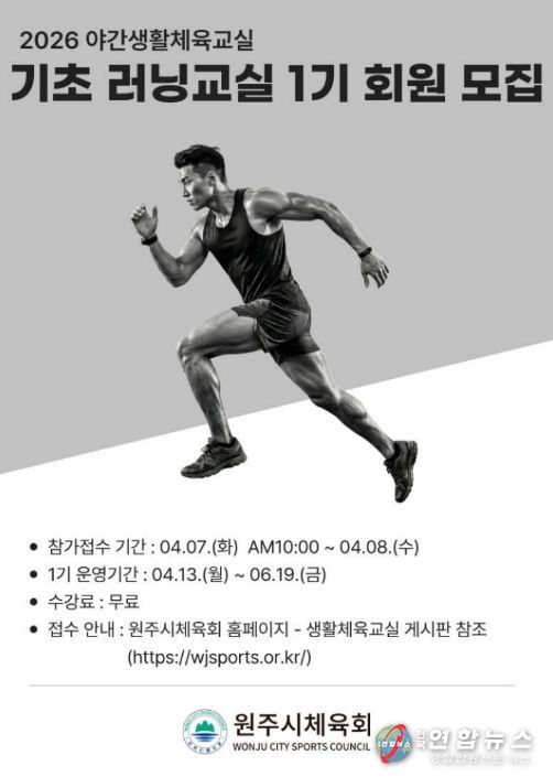 전국연합뉴스 유근택 기자 | 원주시와 원주시체육회는 4월 7일부터 8일까지 ‘2026년 제1기 야간생활체육교실 기초 러닝교실’ 수강생을 모집한다.
