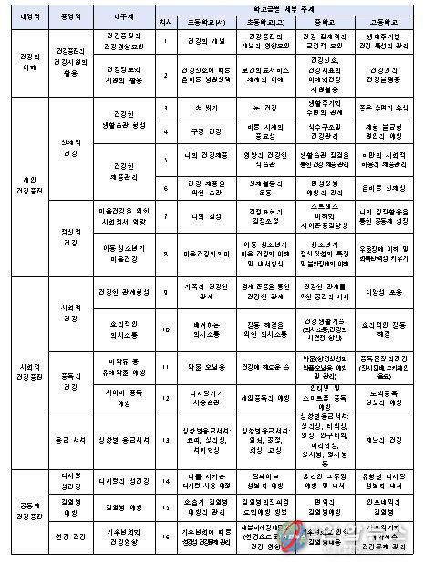 교육부는 현장 의견을 기반으로, 학교에서 활용할 수 있는 교사용 지도서를 개발·배포한다. 이번에 배포하는 지도서는 초등학교부터 고등학교까지 건강증진 교육을 체계적으로 운영할 수 있도록, 시도교육청과 학교의 의견을 수렴해 학교급 전체를 아우르는 주제 영역을 선정했다. 또한, 개발 과정에 학교급별 교원이 직접 참여하여, 상급학교 진학에 따라 학교급에 맞게 건강증진 주제 영역의 교육 내용이 연계·확장되도록 구성했다.