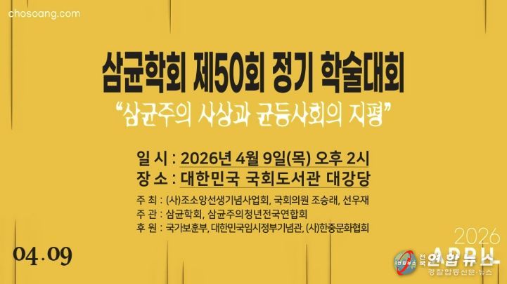 전국연합뉴스 조민준 기자 | 2026년 병오년(丙午年)을 맞아 '삼균학회 제50회 정기학술대회'가 국회도서관 대강당에서 개최된다. 이번 학술대회는 (사)조소앙선생기념사업회, 조승래 국회의원실, (사)선우재가 공동 주최하고, 삼균학회와 삼균주의청년연합회가 주관하며, 국가보훈부, 국립대한민국임시정부기념관, (사)한중문화협회가 후원한다.