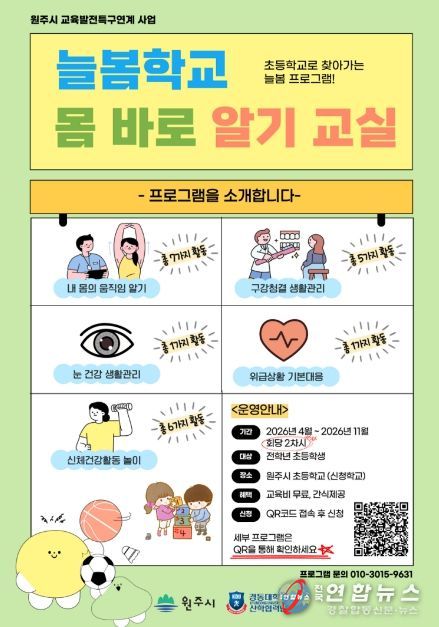 전국연합뉴스 유근택 기자 | 원주시는 교육발전특구 사업의 일환으로 지역 대학과 협력해 ‘찾아가는 우리동네 늘봄학교’를 운영한다. 이 사업은 대학의 전문 인력과 시설을 활용해 초등학생에게 양질의 교육과 돌봄 프로그램을 제공하기 위해 2025년부터 추진해 온 주요 사업이다.