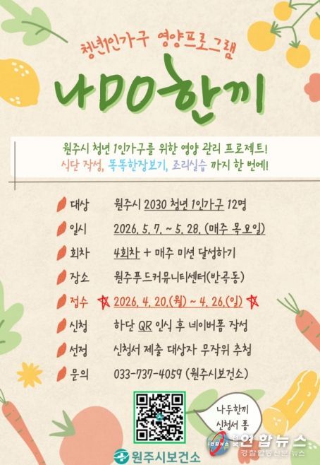 전국연합뉴스 유근택 기자 | 원주시보건소는 관내 2030 청년 1인 가구의 건강한 식생활 자립을 위한 영양관리 프로그램 ‘나DO한끼’ 참여자를 모집한다.