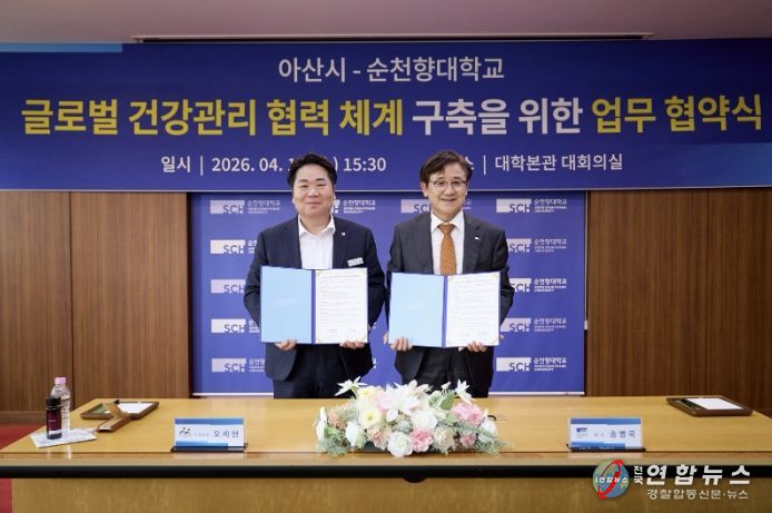 전국연합뉴스 김용태 기자 | 아산시와 순천향대학교가 지난 15일 순천향대학교 본관 3층 대회의실에서 ‘글로벌 건강관리 협력체계 구축’을 위한 업무협약을 체결했다.