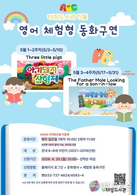 5월에는 ▲아기 돼지 삼형제(Three little pigs) ▲사윗감 찾는 두더지(The father mole looking for a son-in-law) 등 아이들에게 친숙하고 사랑받는 동화를 준비했다. 매주 일요일 오전 10시와 11시 2회차로 운영되며, 참가비는 무료다.