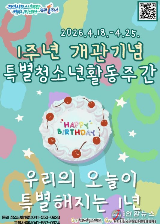 전국연합뉴스 김대환 기자 | 천안시청소년재단 산하 천안시청소년복합커뮤니티센터는 개관 1주년을 맞아 오는 18일부터 25일까지 ‘특별청소년활동체험주간’을 운영한다고 17일 밝혔다.