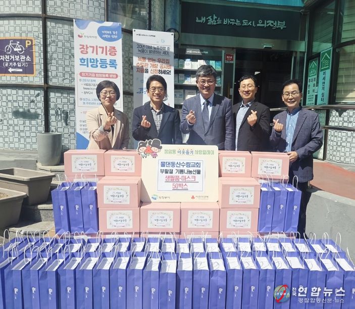 전국연합뉴스 박점규 기자 | 의정부시 장암동주민센터는 4월 16일 물댄동산수림교회가 부활절을 맞아 지역 내 어려운 이웃을 위해 ‘기쁨나눔선물 세트’와 마스크 50상자를 기탁했다고 밝혔다.