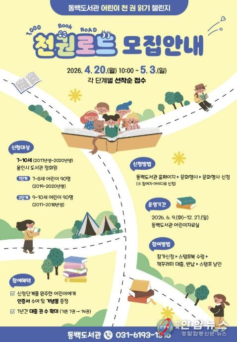 전국연합뉴스 기자 | 용인특례시 동백도서관은 어린이 천 권 읽기 챌린지 ‘천권로드(ROAD)’ 참여자를 모집한다고 20일 밝혔다.