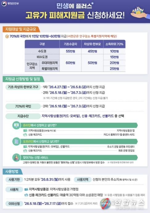전국연합뉴스 김대환 기자 | 서천군이 중동전쟁 여파에 따른 고유가·고환율·고물가 상황으로 어려움을 겪는 군민들을 위해‘고유가 피해지원금’지급을 위한 본격적인 실행 단계에 돌입했다.