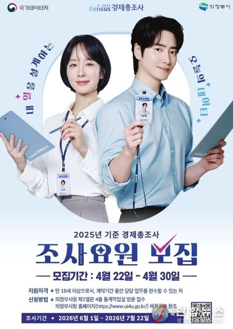 전국연합뉴스 박점규 기자 | 의정부시는 6월 1일부터 실시되는 ‘2025년 기준 경제총조사’의 원활한 추진을 위해 조사요원 77명을 모집한다.