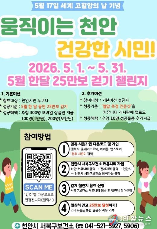 전국연합뉴스 김대환 기자 | 천안시 서북구보건소는 5월 한 달간 ‘움직이는 천안, 건강한 시민!’ 걷기 챌린지를 운영한다고 20일 밝혔다.