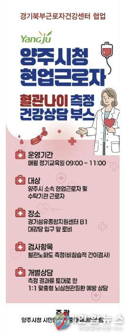 전국연합뉴스 박점규 기자 | 양주시가 현업근로자의 건강 증진과 뇌심혈관계질환 예방을 위해 오는 4월 22일부터 연말까지 ‘찾아가는 근로자 건강상담 부스’를 운영한다.