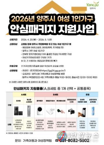 전국연합뉴스 박점규 기자 | 양주시는 관내 여성 1인 가구 등 범죄 취약 여성 가구의 안전한 일상을 지원하기 위해 ‘2026년 양주시 여성 1인 가구 안심패키지 지원사업’을 추진한다.