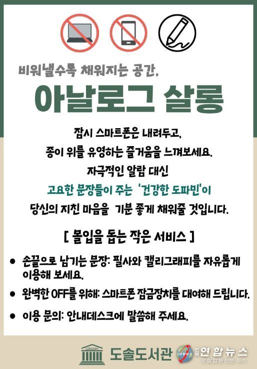 이충미 도솔도서관장은 “이번 프로그램을 통해 시민들이 디지털 기기와 잠시 거리를 두고, 깊이 있는 독서와 손글씨 쓰기를 통해 문해력을 향상시키는 계기가 되길 바란다”며 “지역사회의 지속가능한 아날로그 독서 문화를 정착시키는 구심점이 될 수 있도록 노력할 것”이라고 말했다.