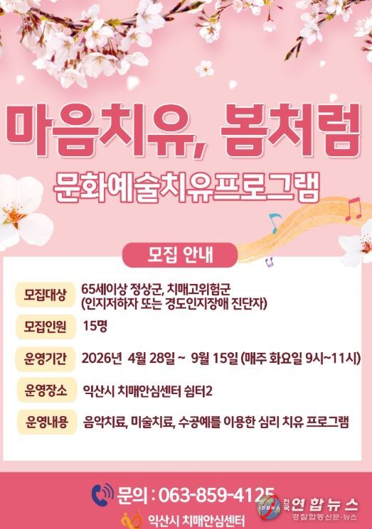 전국연합뉴스 최성용 기자 | 익산시는 보건소 치매안심센터에서 고령층 문화예술 치유프로그램 '마음치유, 봄처럼' 참여자 15명을 선착순으로 모집한다고 21일 밝혔다.