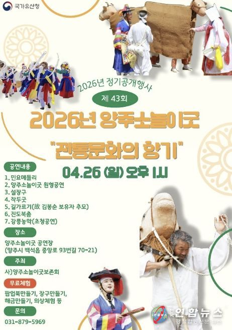 전국연합뉴스 박점규 기자 | 양주시는 국가유산청의 지원을 받아 ‘제43회 양주소놀이굿 정기공개행사’를 오는 26일 오후 1시, 양주소놀이굿 전수교육관 공연장에서 개최한다고 밝혔다.