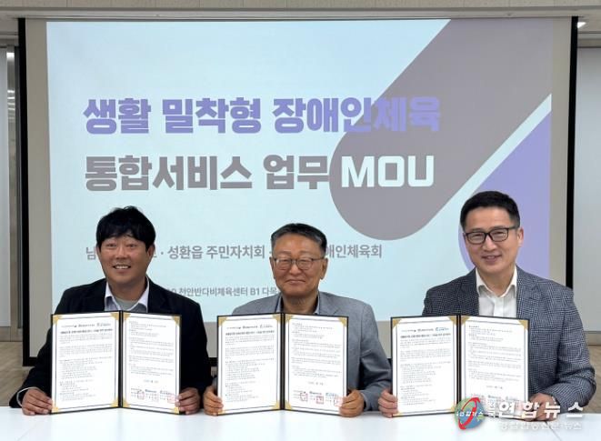 전국연합뉴스 김대환 기자 | 천안시장애인체육회는 22일 천안반다비체육센터에서 성환읍 주민자치회, 남서울대학교와 ‘생활밀착형 장애인체육 통합서비스 구축을 위한 업무협약’을 체결했다.