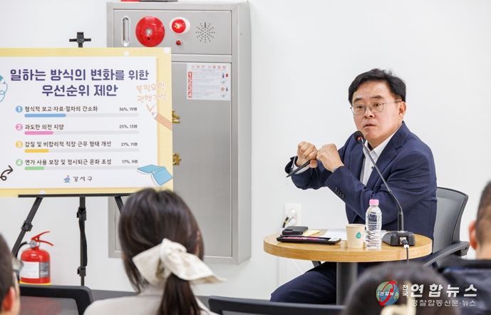 전국연합뉴스 김태연 기자 | 진교훈 강서구청장이 22일 수요일 주요 계약‧인허가 등 부패 취약분야 부서 직원들과 청렴 소통 간담회를 가졌다.