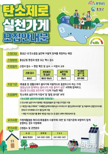 신청은 홍성군청 환경과 청소행정팀 방문 또는 팩스로 연중 수시 신청 가능하며, 지정 기준은 ▲1회용품 및 생활쓰레기 줄이기에 자발적으로 동참 ▲‘충청남도와 함께하는 플라스틱 사용 줄이기 실천’ 서약 참여 ▲‘충남형 탄소중립 포인트제’ 가입이 가능한 곳이어야 한다.