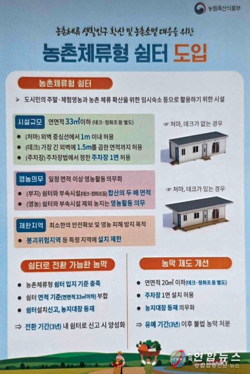 농촌체류형 쉼터는 농촌 생활인구 확산과 농촌 소멸 대응을 위해 도입된 제도로, 농업경영의 편의를 높이고 영농의 효율성을 높이는 데에도 의미가 있다.