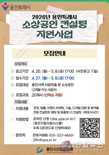 전국연합뉴스 기자 | 용인특례시와 용인시산업진흥원은 ‘2026년 용인시 소상공인 창업 및 경영 컨설팅 지원사업’에 참여할 소상공인을 모집한다고 26일 밝혔다.