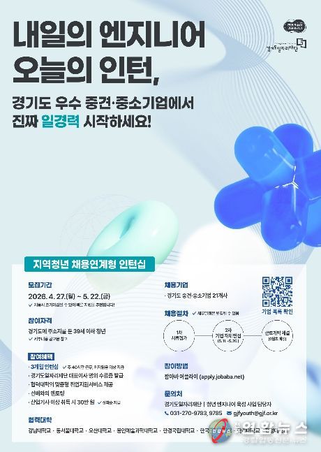 전국연합뉴스 조민준 기자 | 경기도일자리재단은 도내 청년을 대상으로 직무 중심의 실무 경험을 제공하는 ‘청년 엔지니어 육성 사업: 지역 청년 채용 연계형 인턴십’ 참여자를 모집한다.