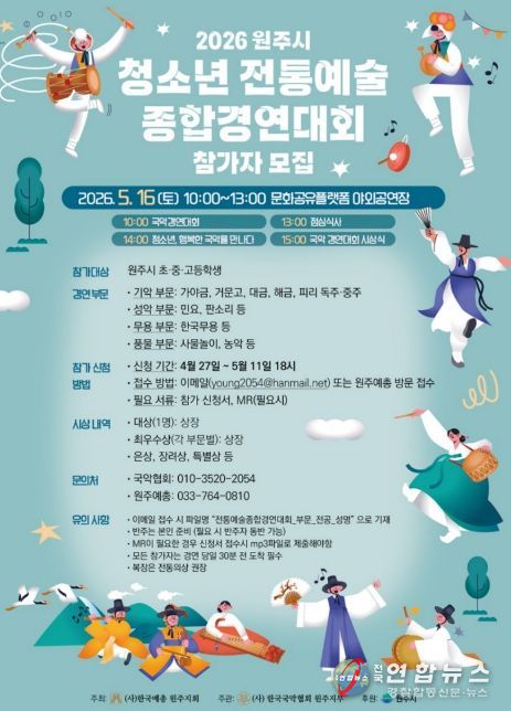 모집 부문은 ▲전통예술 종합경연대회 ▲청소년 트로트·가요·댄스 페스티벌 ▲원주청소년연극제 ▲학생음악콩쿠르 ▲치악산 전국 청소년 백일장 등 총 5개 분야다.